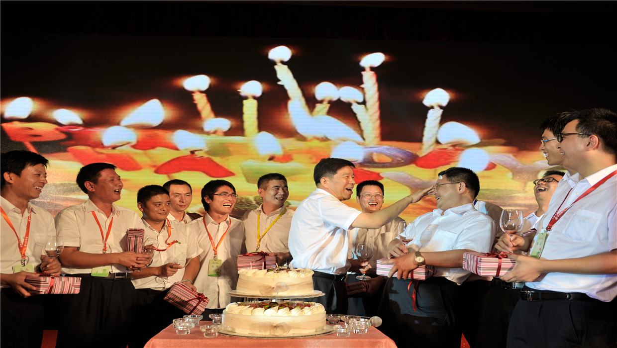 2013年7月,在武漢召開(kāi)的“中天集團(tuán)2013年工程管理現(xiàn)場(chǎng)會(huì)”上,樓永良董事長(zhǎng)為員工慶祝生日?!刑炝?/p>