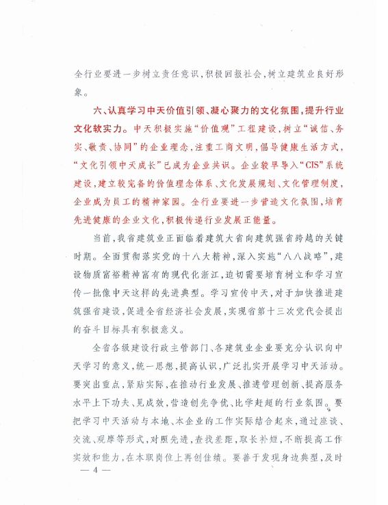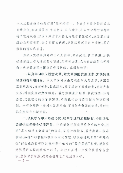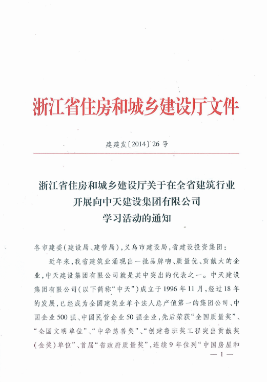 《浙江省住房和城鄉(xiāng)建設(shè)廳關(guān)于在全省建筑行業(yè)開展向中天建設(shè)集團(tuán)有限公司學(xué)習(xí)活動的通知》
